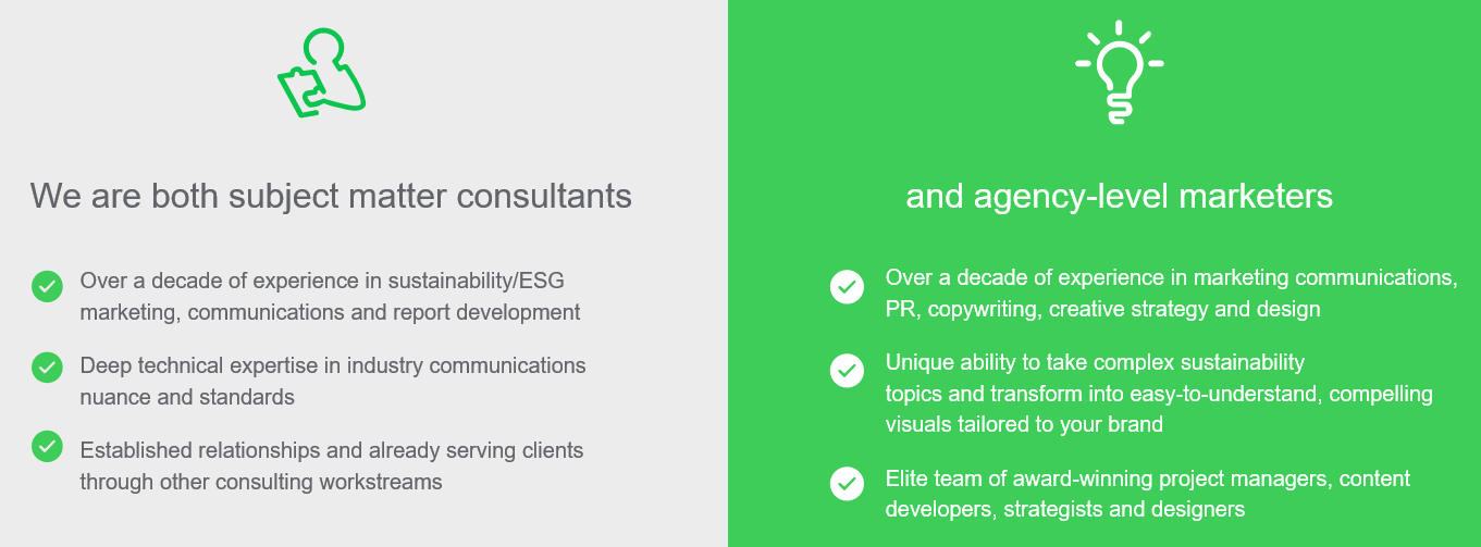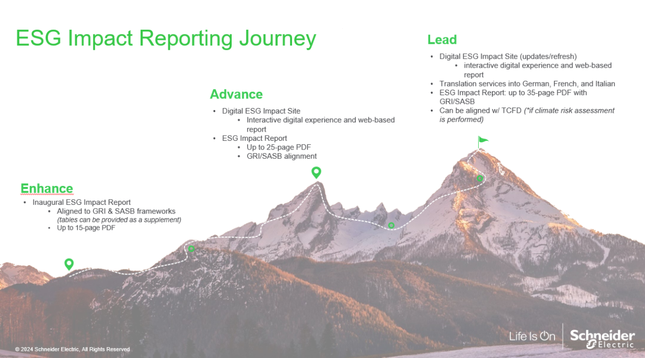 Clients choose Schneider Electric's team of Marketing Experts because of our ability to craft a unique and cohesive narrative around their sustainability journey. Our teams work doesn't end with simply crafting the report. Our insights help clients uncover impactful product marketing & messaging backed by sustainability data to engage with stakeholders on what matters most to them. The team's expertise can be leveraged to address ESG rating/rankings through reports and respond to stakeholder questions through targeted communications.