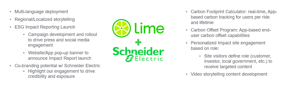 Schneider Electric is thrilled with the prospect of partnering with Lime to develop and amplify your ESG story. We see a unique opportunity to synthesize Lime's mission and efforts into an impactful storyline with a unified voice that meets global voluntary and mandatory sustainability framework standards.