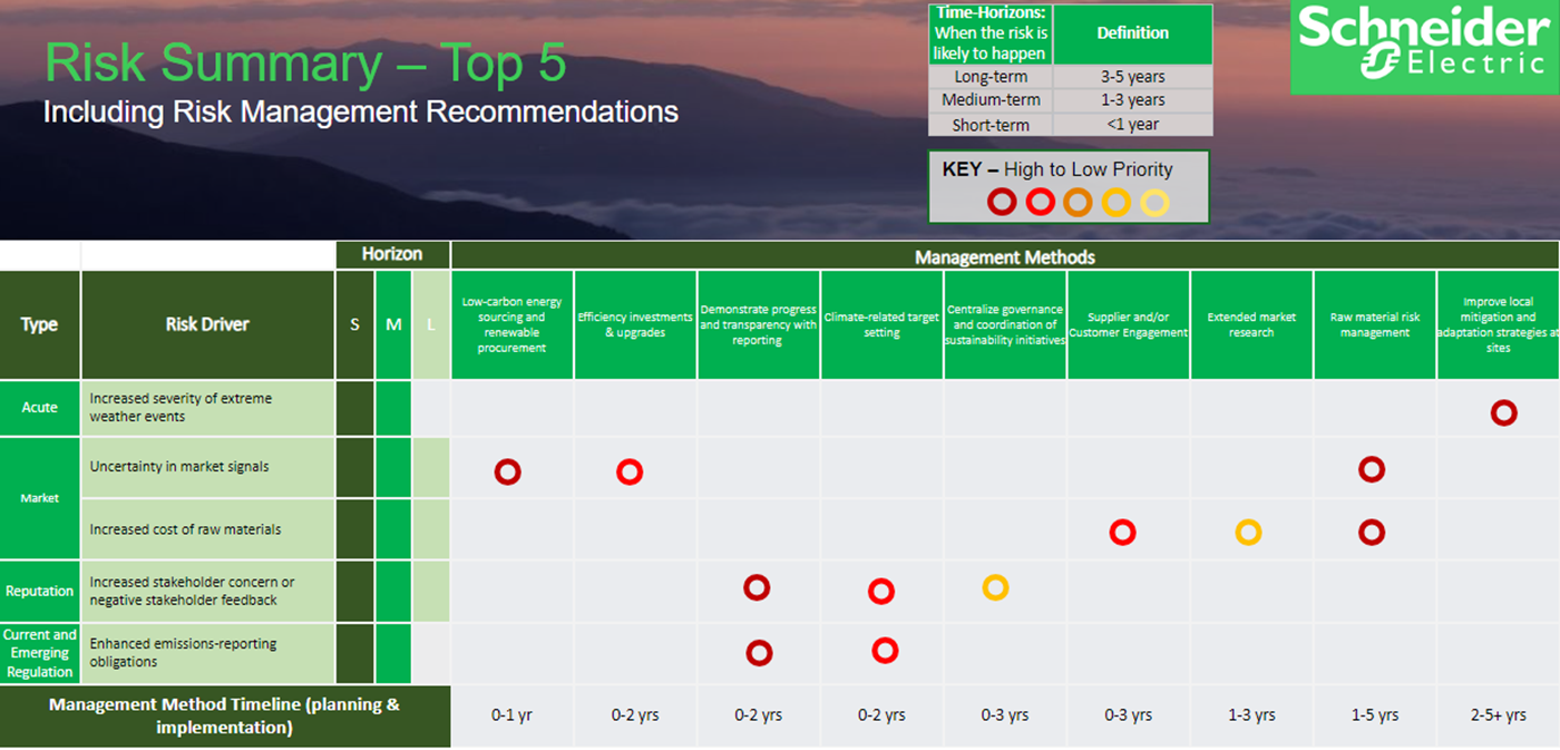 Schneider Electric’s team is uniquely positioned to help companies develop strategies for meeting energy management and sustainability objectives and to help implement those strategies. The company’s core services include market and climate risk analysis, energy efficiency, energy management, sustainability consulting, and renewable energy and carbon advisory. Schneider Electric can support with more than your ESG strategy, from the implementation of renewable energy to onsite BMS systems, our organization is equipped to lead your team on your ESG journey.